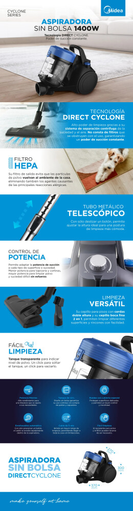 La Aspiradora Midea VS-S214TAR4 combina potencia, eficiencia y diseño moderno para ofrecer una limpieza profunda sin complicaciones. Gracias a su tecnología DirectCyclone, separa eficazmente el polvo del aire mediante un sistema centrífugo que mantiene una succión constante y evita la obstrucción de filtros. Con 1400 W de potencia, filtro HEPA que elimina alérgenos y un tanque transparente de 1.5 L, podrás limpiar más y vaciar menos. Su control de potencia, enrollacable automático y sistema de vaciado con un solo clic brindan comodidad total. Ideal para quienes buscan rendimiento, durabilidad y un aire más puro en el hogar.