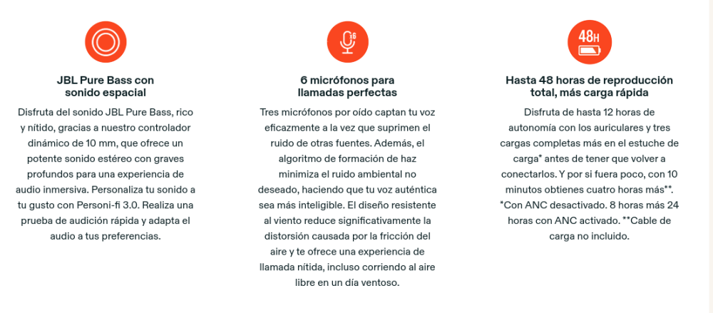 ![]() | CANCELACIÓN DE RUIDO ADAPTATIVA CON SMART AMBIENT Disfruta de la banda sonora de tu vida. Cuatro micrófonos con detección de ruido minimizan las distracciones y maximizan la calidad del audio, mientras que Smart Ambient te mantiene totalmente al tanto de tu entorno y te ayuda a hablar con quienes te rodean sin tener que quitarte los auriculares. Usa la app JBL Headphones para configurar tus niveles personalizados. |