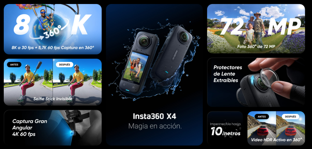 El Kit Cámara de Acción Insta360 X4 Air Starter Bundle CINSAAFA - Negro. Diseñada para creadores y videógrafos exigentes, esta cámara portátil ofrece grabación de video de 360° en impresionantes resoluciones de 8K y 6K, con compresión H.265 para videos de calidad superior. Su diseño ultraligero y sumergible hasta 15 metros la convierte en la compañera perfecta para aventuras acuáticas y al aire libre. El paquete incluye un palo de selfie invisible, una batería adicional y una tapa para el objetivo, garantizando que estés listo para cualquier situación. La Insta360 X4 Air no solo captura videos; también produce fotografías de 29 MP, asegurando un contenido nítido y vibrante. Con el modo Me, experimenta videos en primera persona de 170°, mientras que la estabilización de imagen de seis ejes y el bloqueo del horizonte garantizan tomas suaves y niveladas. Además, la aplicación Insta360 ofrece opciones de edición avanzadas, como el Deep Track 3.0, para una experiencia de usuario optimizada. Controla la cámara con gestos o comandos de voz, y utiliza el software de escritorio Insta360 Studio para una postproducción profesional. La conectividad Wi-Fi y Bluetooth 5.2 asegura que permanezcas conectado, mientras que su batería de 2010 mAh ofrece hasta 88 minutos de grabación en 8K. Con la Insta360 X4 Air, cada momento se transforma en una obra maestra cinematográfica.