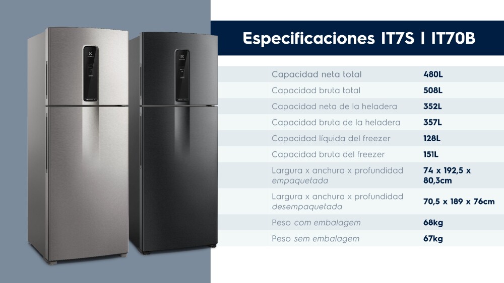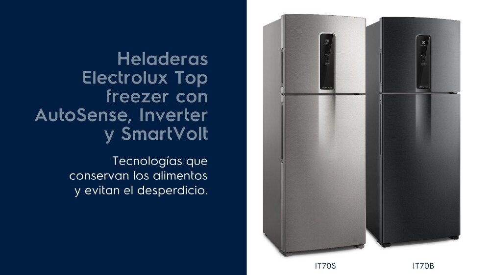 Heladera Electrolux IT70S de 474 L, tecnología AutoSense y motor Inverter. Conserva mejor tus alimentos con estantes adaptables, freezer espacioso y cajón HortiNatura. Moderna y eficiente.