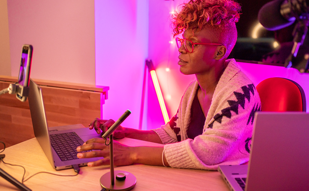 Pulsa el centro del mando de control para silenciarte momentáneamente. Las luces LED de la parte superior del tubo del micrófono cambiarán a rojo, para que siempre sepas cuándo estás en silencio. A diferencia de algunos de sus compañeros de trabajo durante las reuniones de Zoom.