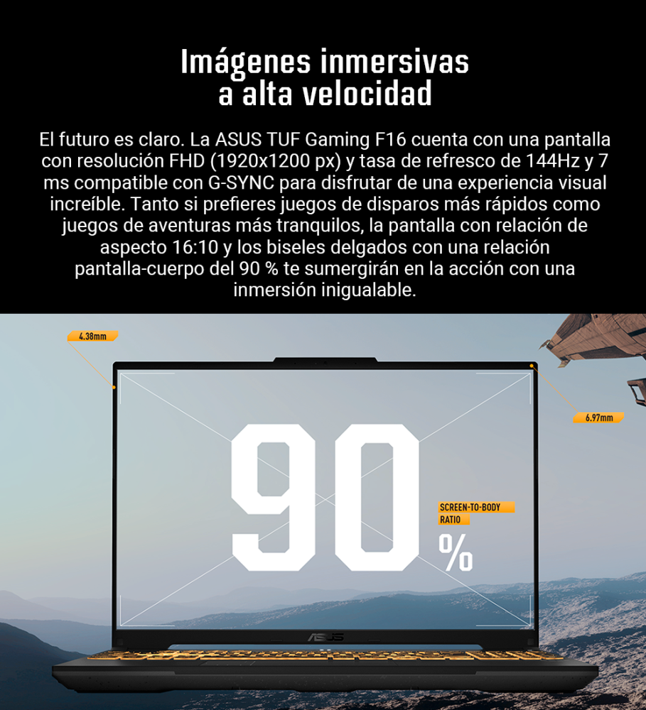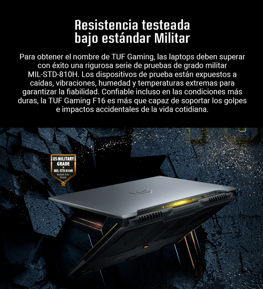 El TUF Gaming F16 conserva su estilo clásico TUF, con algunos toques nuevos. La versión Mecha Gray luce el logotipo de TUF en relieve. Cuatro pequeños triángulos enmarcan las esquinas de la tapa, y sutiles referencias a TUF aparecen en la superficie del teclado y el trackpad.