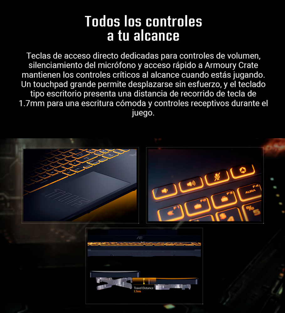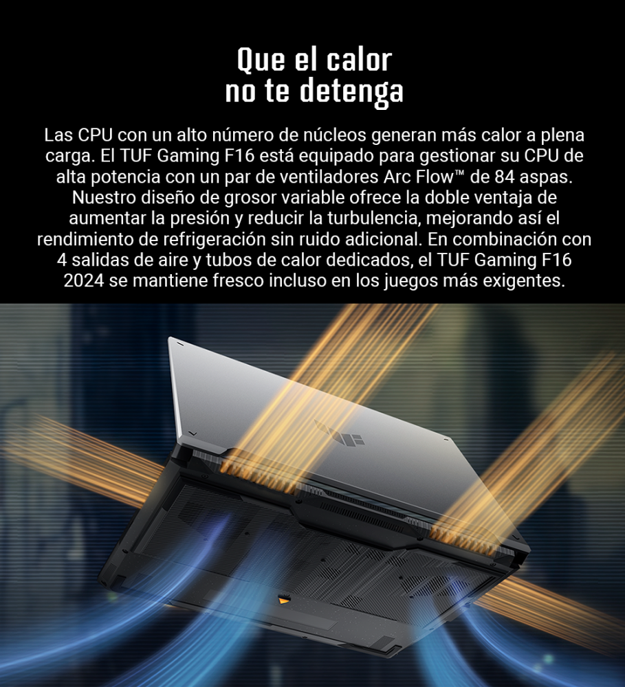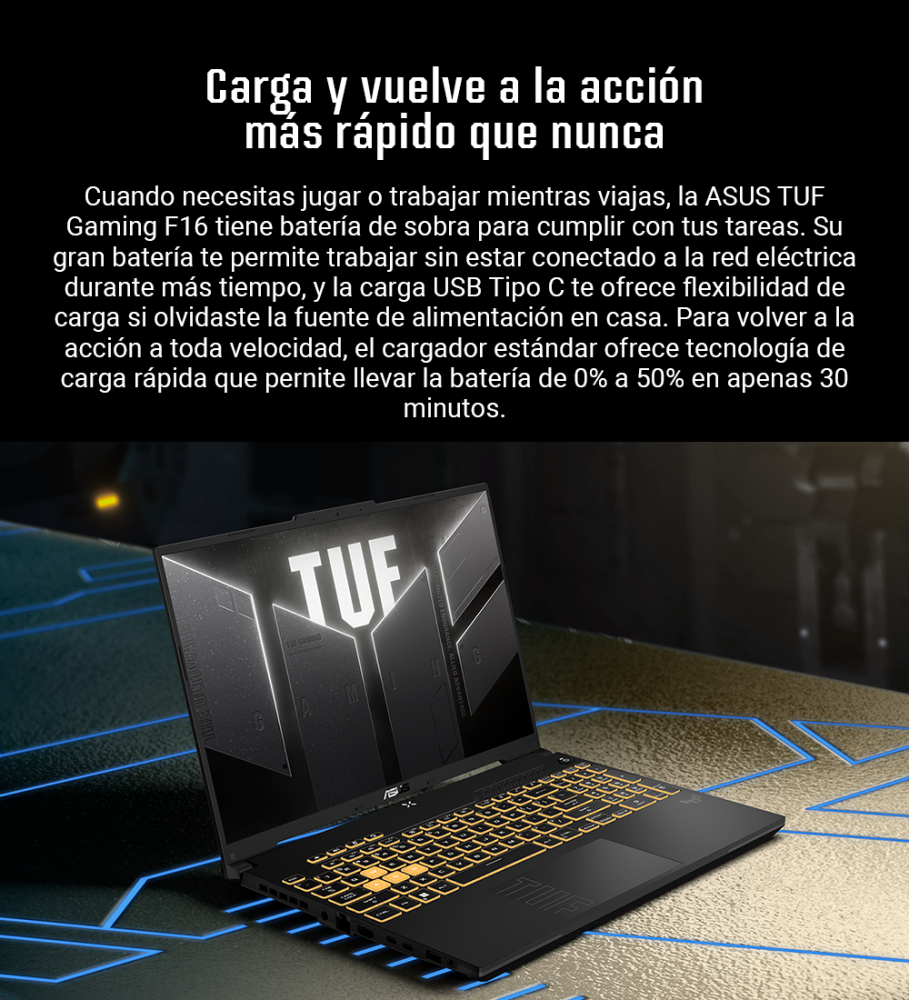 Mejora tu JuegoJuega, transmite y haz más a velocidades increíbles con el procesador intel 5 210H. Esta CPU de alto rendimiento está diseñada para ofrecer juegos y creación de contenido de nivel profesional, especialmente con un sistema de refrigeración completo. | Mejora tus GráficosLa Tuf Gaming F16 viene equipada con una GPU NVIDIA geforce RTX 3050A para portátiles, lo que te da la libertad de usar todos los controles deslizantes gráficos al máximo y disfrutar las velocidades de fotogramas ultraaltas. Gracias a la compatibilidad con NVIDIA advanced Optimus, la portátil activa automáticamente su interruptor MUX al iniciar un juego, lo que te permite disfrutar de un alto rendimiento cuando lo necesitas y de ahorro de energía cuando navegas por internet. | Más MultitareaLos procesadores de alto rendimiento rinden al máximo cuando se combinan con una memoria de igual capacidad, por lo que equipamos la TUF Gaming F16 con memoria de alta velocidad de 3200 MT/s. Esta memoria rápida optimiza las tareas diarias y permite que la CPU rinda al máximo para obtener mayores FPS en el juego.Ambas ranuras de RAM son totalmente accesibles, lo que facilitan el mantenimiento o las actualizaciones posteriores. |